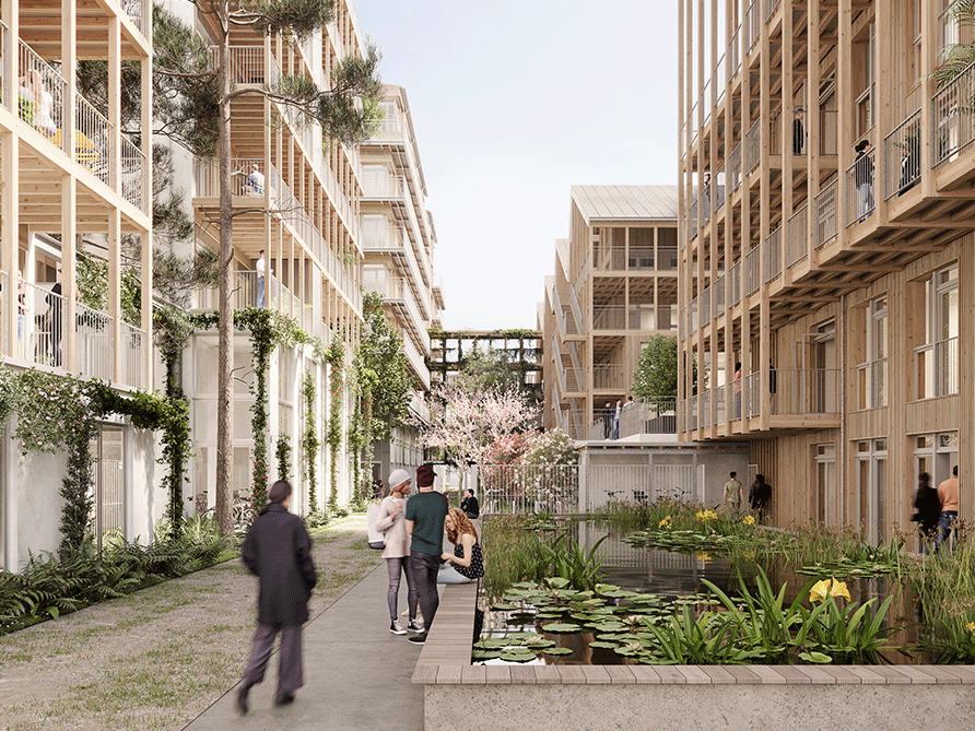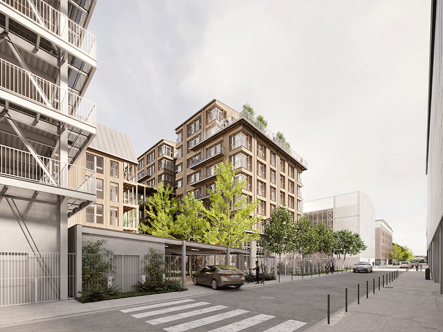 Si les toitures en dents de scie des logements s’inspirent de la forme des usines Alstom qui occupaient autrefois le site, l’architecture n’en reste pas moins avant-gardiste : les corps des bâtiments sont reliés entre eux, à chaque étage, par des passerelles suspendues et ouvertes sur l’extérieur. Avec leur structure béton, particulièrement solide, et leurs larges façades bois, les lieux perpétuent une mémoire visuelle dont ils proposent une vision durable et futuriste. La qualité architecturale de matériaux se double ici d’une très haute performance énergétique des logements.