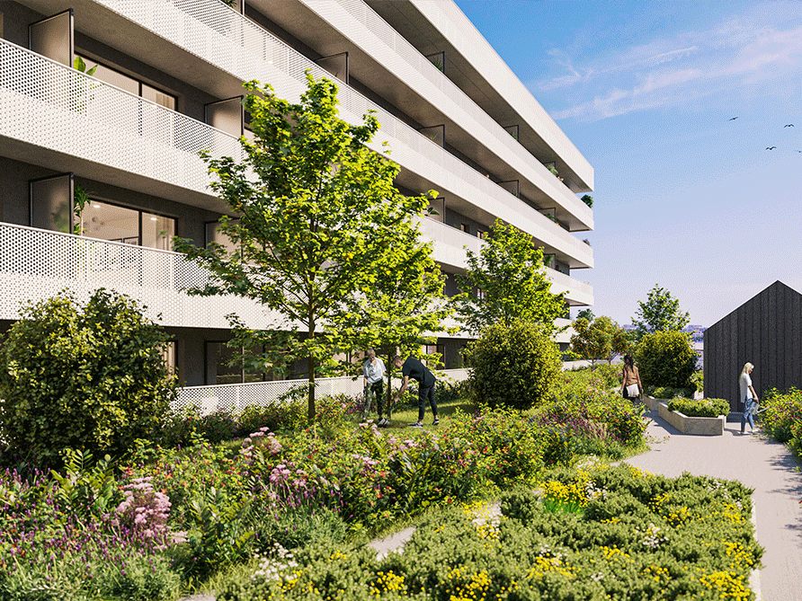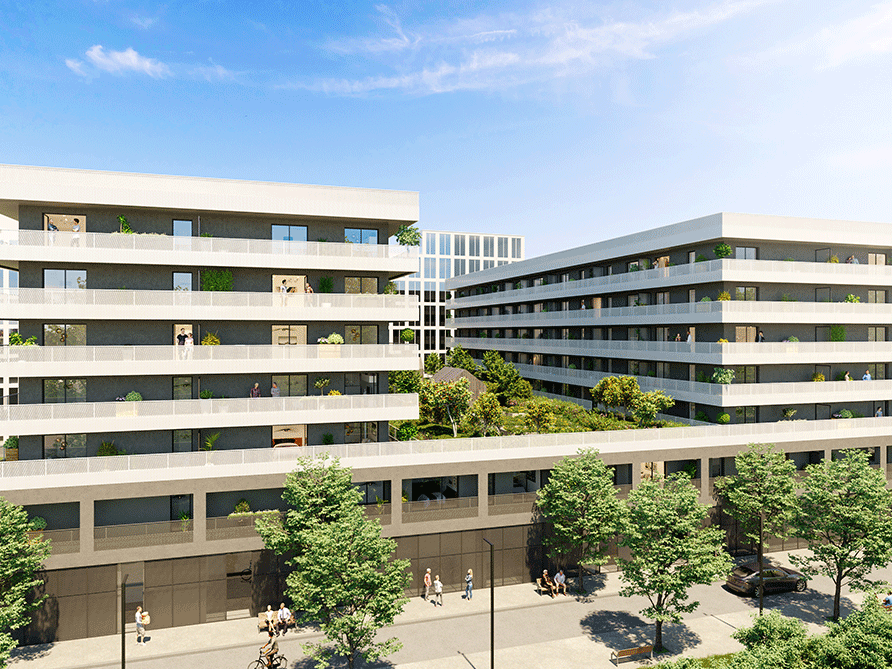 Reposant sur un socle vitré et métallique de teinte grise, la résidence présente une silhouette élégante, composée de deux émergences parallèles, offrant un espace de respiration et de clarté en cœur d’îlot. Rythmée par ses balcons filants, rehaussés avec légèreté par des garde-corps en métal perforé de couleur blanche, elle offre une allure graphique, renforcée par la sobriété d’une teinte grise. La résidence affirme sa personnalité à travers son architecture dans ce paysage citadin. Ses balcons fleuris par vos soins ne seront pas sans rappeler le cœur d’îlot suspendu et l’aspérité de cette réalisation.