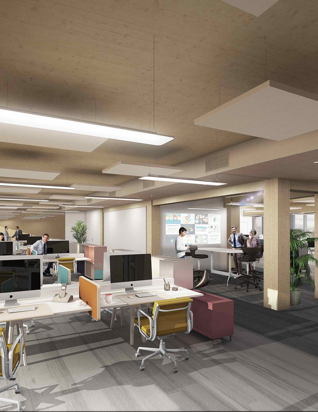 « En complément de la performance environnementale et énergétique du bois, notre travail architectural a consisté à manifester les qualités d’ambiance, de chaleur et de couleur, que ce matériau apporte à l’espace de bureaux."