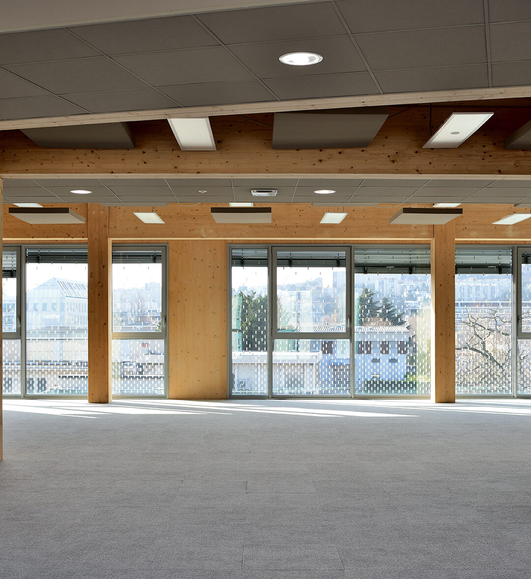 Ce bâtiment tertiaire, de six niveaux, est une construction innovante, réalisée à 70% en construction bois et en matériaux biosourcés. Outre les gains sur l’énergie grise de l’ouvrage, ce parti pris structurel assure un stockage carbone biogénique de plus de 500 T de CO2 équivalent. Conscients que tout matériau neuf engendre une consommation d’énergie et de ressources supplémentaires, la volonté de mettre en place une démarche d’économie circulaire sur le projet a également émergé rapidement. Le recours à des dalles de faux planchers issues du réemploi permet notamment d’économiser 100 tonnes de CO2 équivalent.
